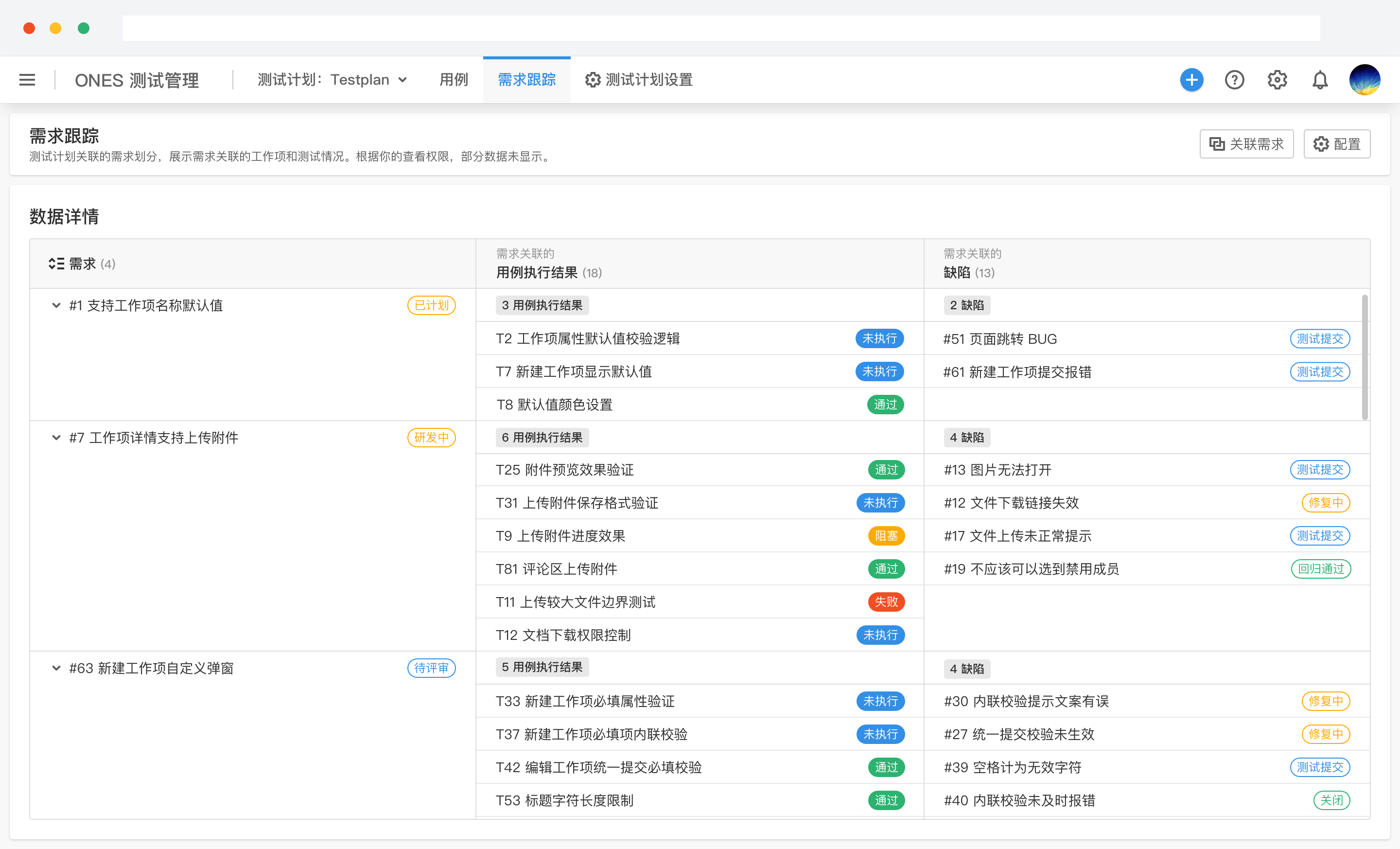 在 ONES Testcase 中,我们可以按照不同的目标组织测试计划,在测试计划中添加关联用例,并将测试计划关联到具体的项目和迭代。在测试过程中,测试人员也可以利用需求跟踪矩阵,直观地了解当前测试计划所关联需求的用例覆盖和执行情况。