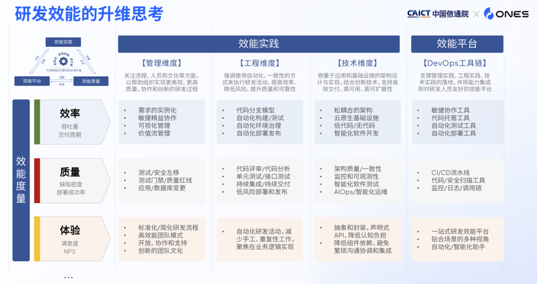 对于研发效能的提升,首先是要升维思考,我强调研发效能不是解决局部的效率问题,也不是单点的工具或资源问题,而要从全局化、系统化的角度去寻求解决方案。同时,我们还要降维执行,要下钻到一线去解决具体的问题,并结合新技术与时俱进。