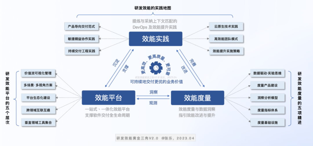 在 2021 年,我提出了「研发效能黄金三角」的框架,将效能实践、效能平台和效能度量统一起来。经过这两年的持续探索和实践沉淀,我把这个模型升级成了 2.0 版本,在框架里增加了更多细节描述,比如效能实践地图、效能平台的五个层次、效能度量的五项精进等,目的是让我们对于研发效能提升的理解具有全局性和系统性。