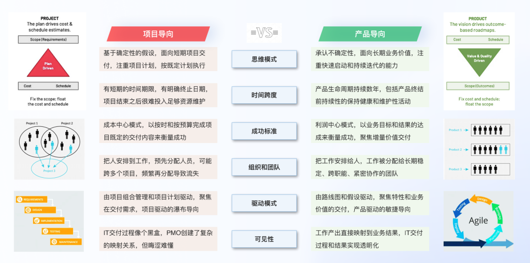 项目导向是把人安排在工作上,一个人在一年里可能换了七八个项目,但他很难在每一个项目里都有积累、跟团队磨合得很好,也很难产生很高的效能。而产品导向,就是要长期稳定的团队来负责长期稳定的产品,从而产生长期稳定的价值。另外,这两种模式在组织与团队、驱动模式和可见性等方面都有着完全不同的处理方式。