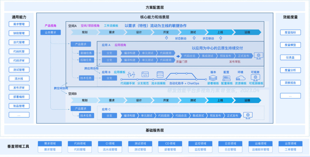 要做好工具平台的建设,就要从三个视角出发,分别是产品视角、项目/空间视角、应用视角。这三层是一个相互嵌套的关系,越往外层越是产品和业务导向的;越靠内层越是工程和技术导向的。参见下图:
