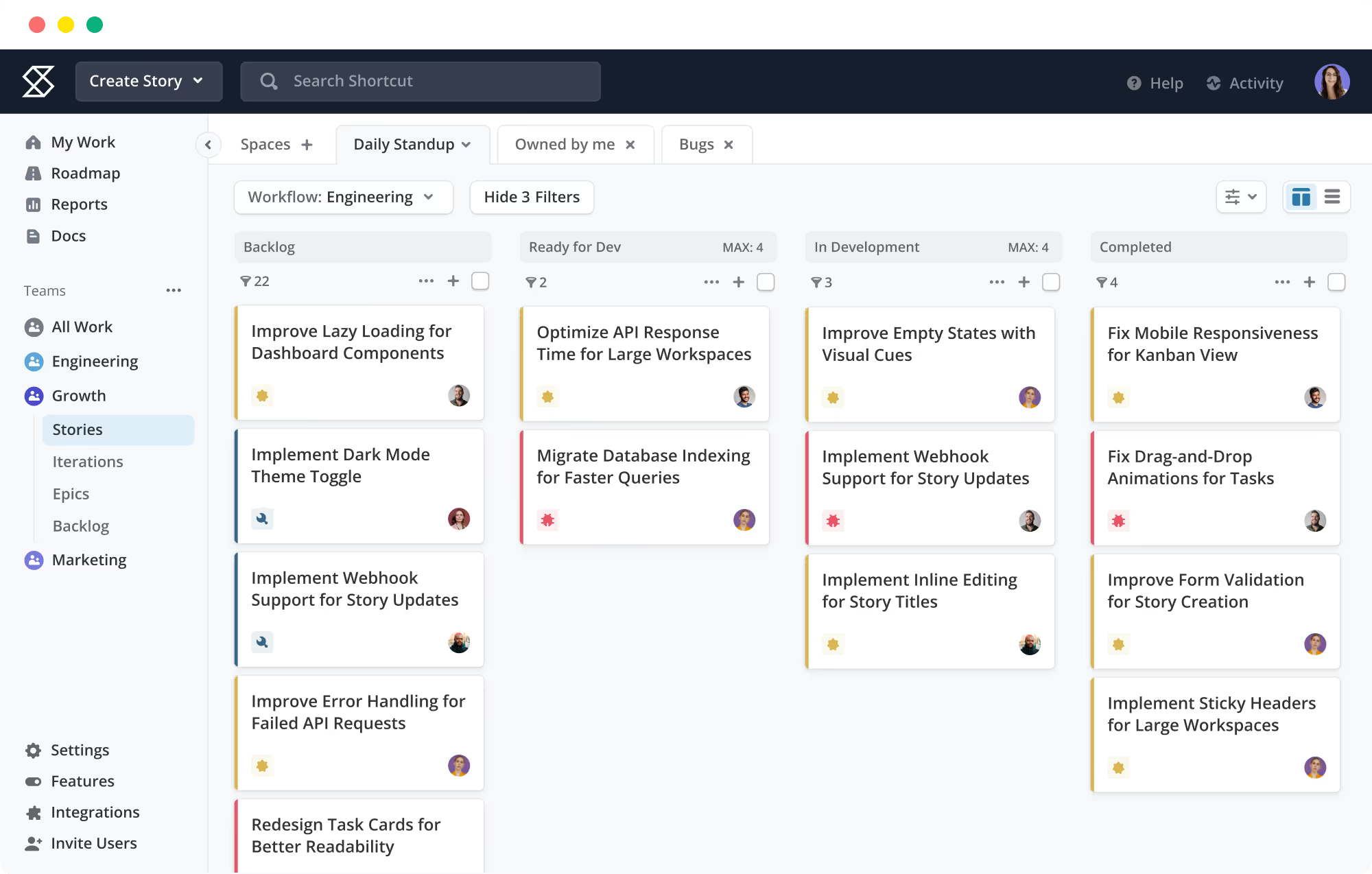 在敏捷项目管理能力上,Shortcut 的 Iteration 让你能比较容易地组织 Scrum 的关键动作:迭代开始前做 planning、迭代中推进、迭代结束 review/retro。它的优势是不会像重型系统那样一上来给你大量配置负担;但如果你所在组织需要很强的组合管理、复杂权限与跨项目治理,仍需要评估它的上限。