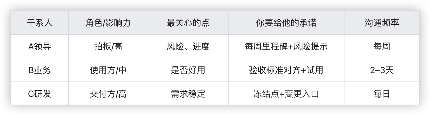 我通常会做一个轻量的干系人表,把“影响力”和“关注点”写清楚,并提前约定沟通频率: