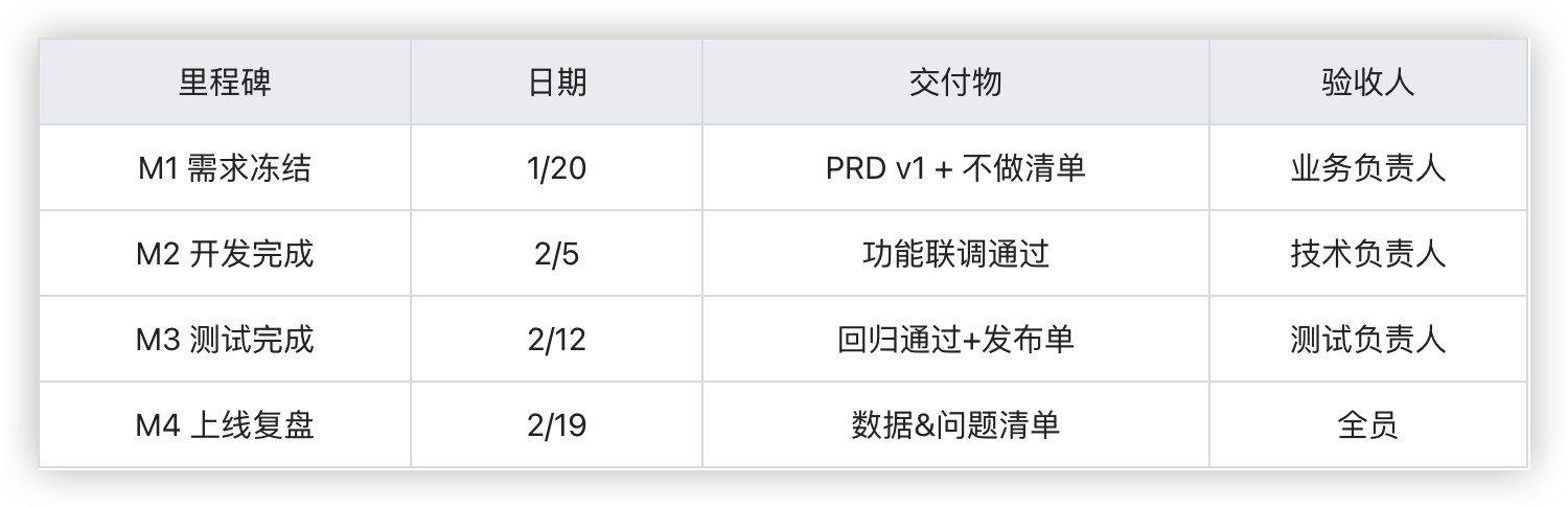 完成判据:每个里程碑都有“可验证交付物”,并且有明确验收人。