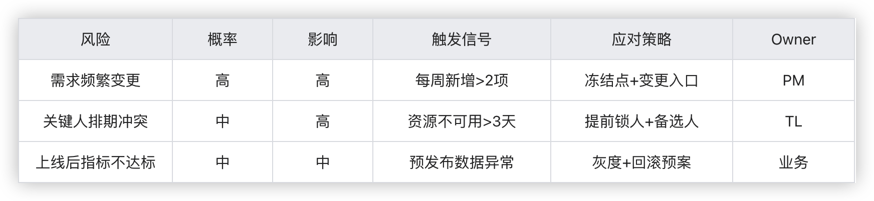 4.风险清单要变成行动清单:写“可能延期”没用,写“触发信号+应对动作+负责人”才有用。