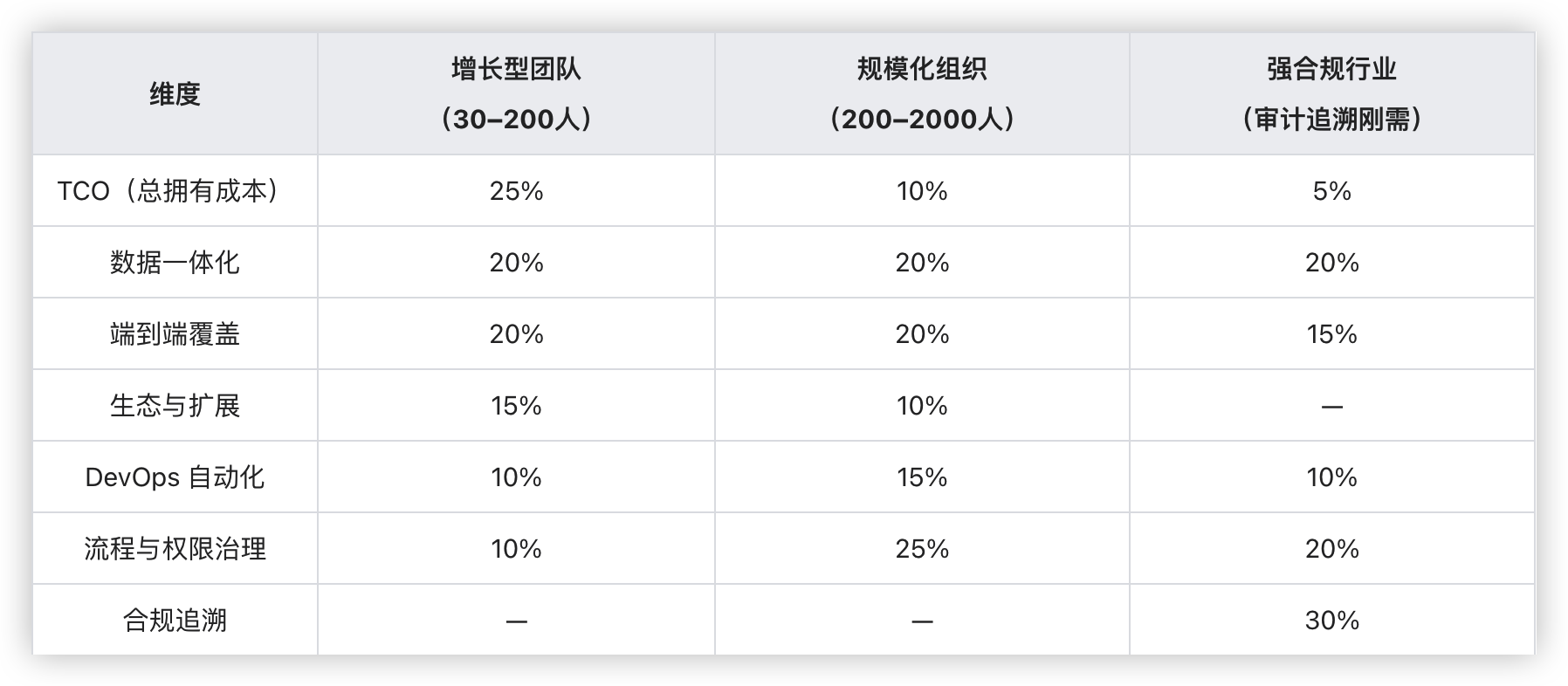 我常用 6 维打分(每维 1–5 分),并按组织类型分配权重,组织类型通常会分为增长型团队(30-200人)、规模化组织(200-2000人)和强合规行业(审计追溯刚需)。