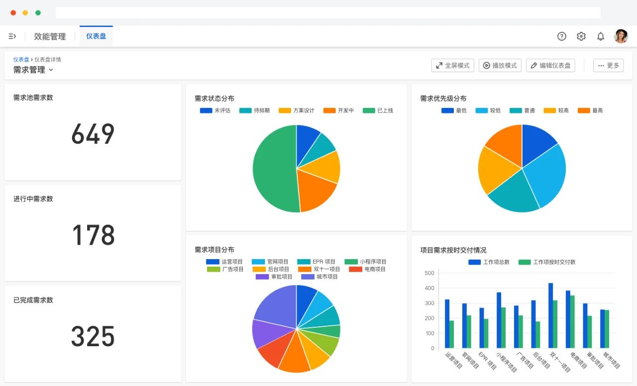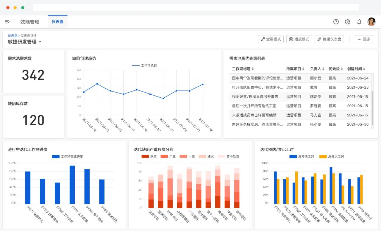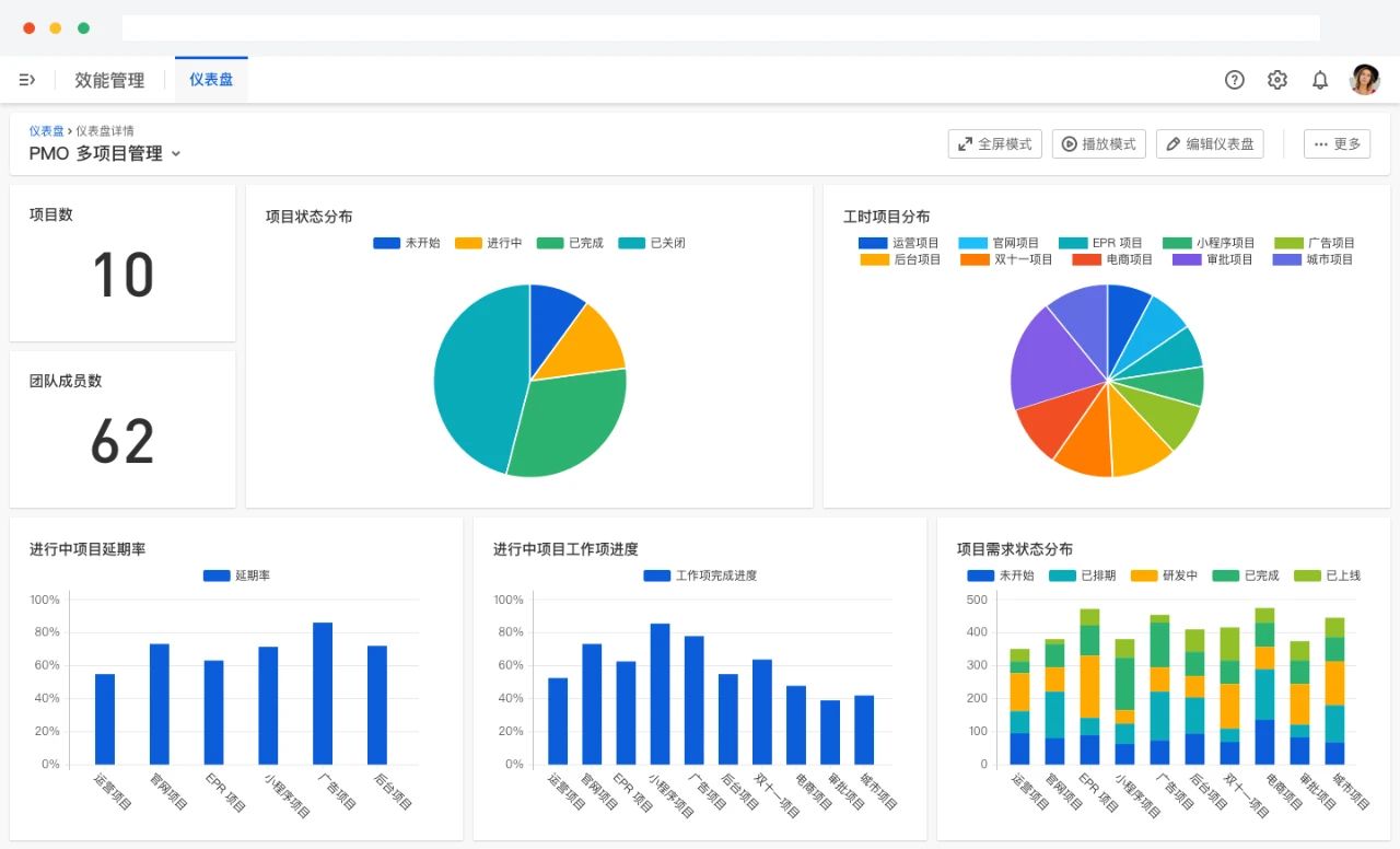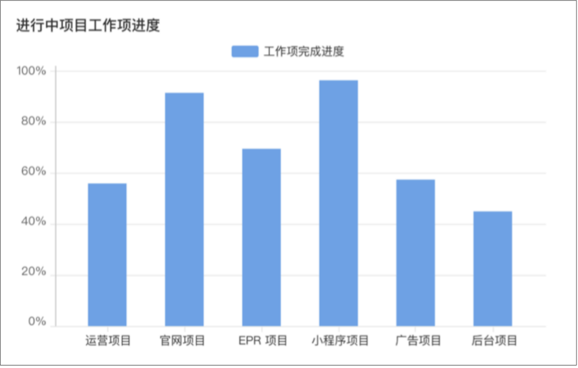 3. 进度情况:监控项目的进展及延期情况,保障按时交付。如「项目进度」体现了已完成工作项占全部工作项的比例,帮助管理者及时发现并应对进度风险。