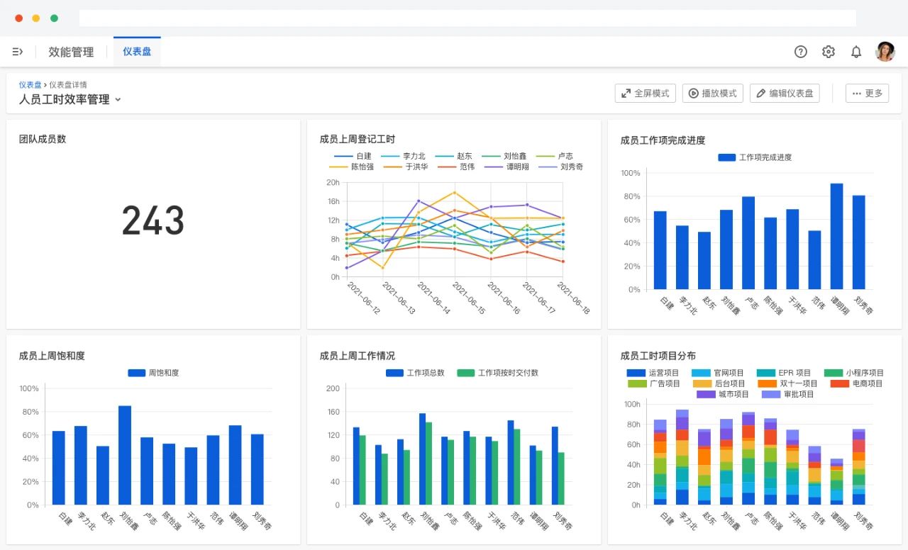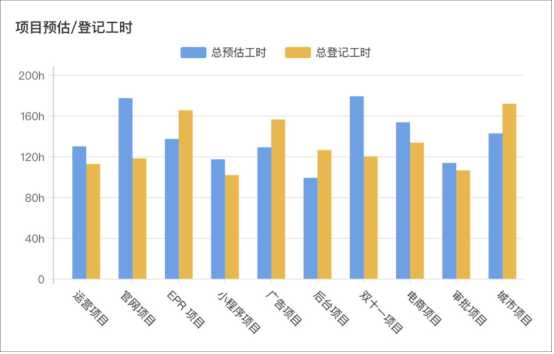 4. 资源效率:度量团队的工作效率及资源利用率,帮助改进团队人效。如「工时预估和实际投入对比」体现了项目工时预估偏差及承诺执行情况,当偏差过大,则需评估团队是否存在亟待解决的技术债务。