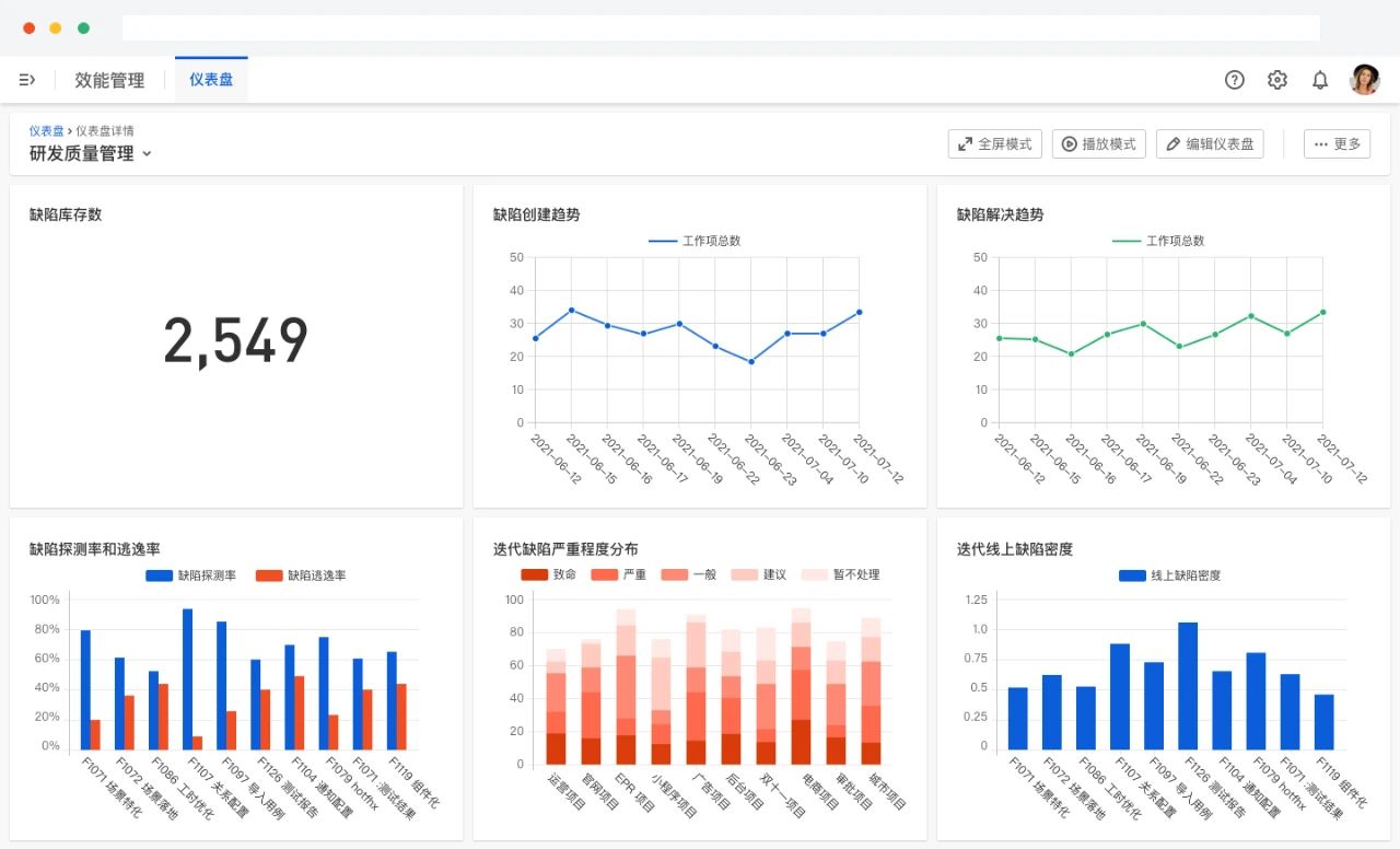 以 CMMI 研发过程改进仪表盘模板为例,根据 CMMI 能力成熟度模型,该模板内置了度量质量、按时交付率、预估准确性、交付速度等方面的团队效能数据,帮助实现持续改进。