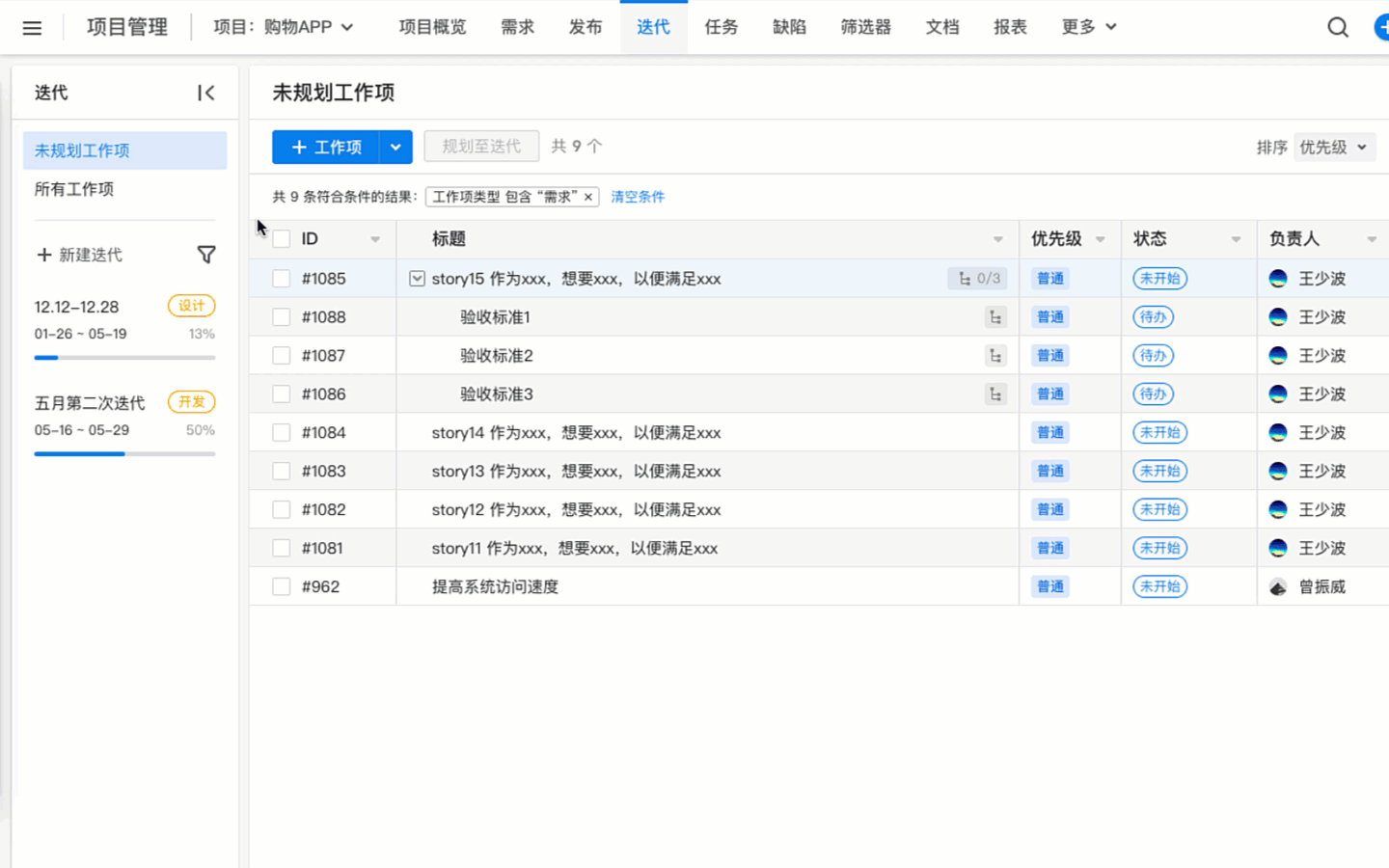 1、产品负责人先将需求按确定的优先级顺序,从产品需求池(Product Backlog)规划至对应迭代。产品负责人可创建新的迭代,并设置迭代周期和迭代阶段,可自定义多种属性字段,丰富迭代信息。