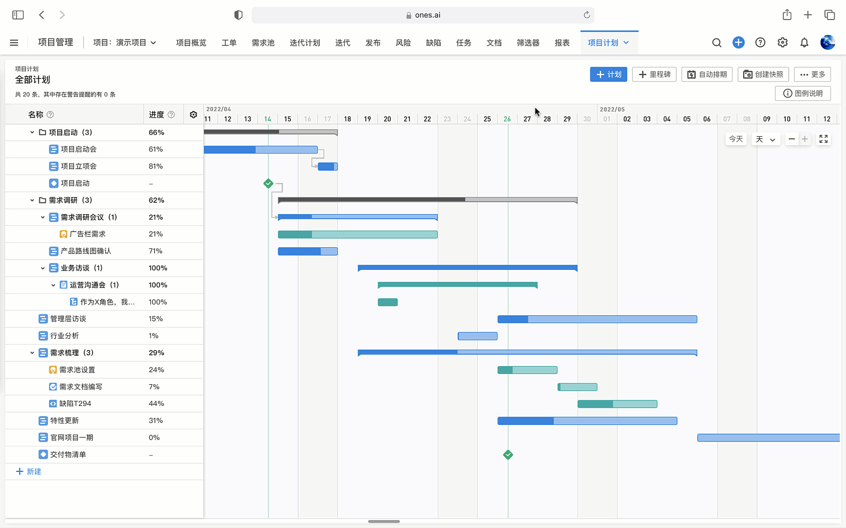 2、支持项目里程碑等高层级规划、甘特图跟进多个迭代进度,灵活调控进度和周期。